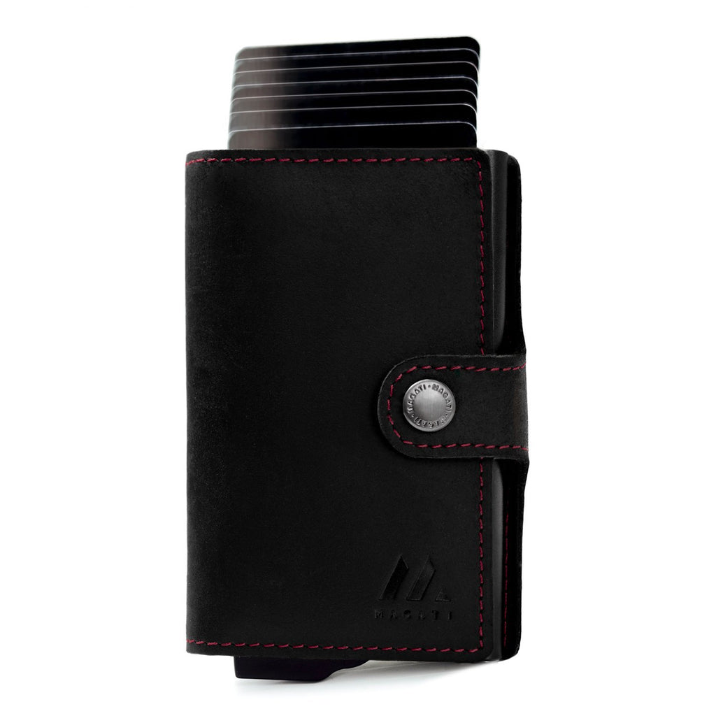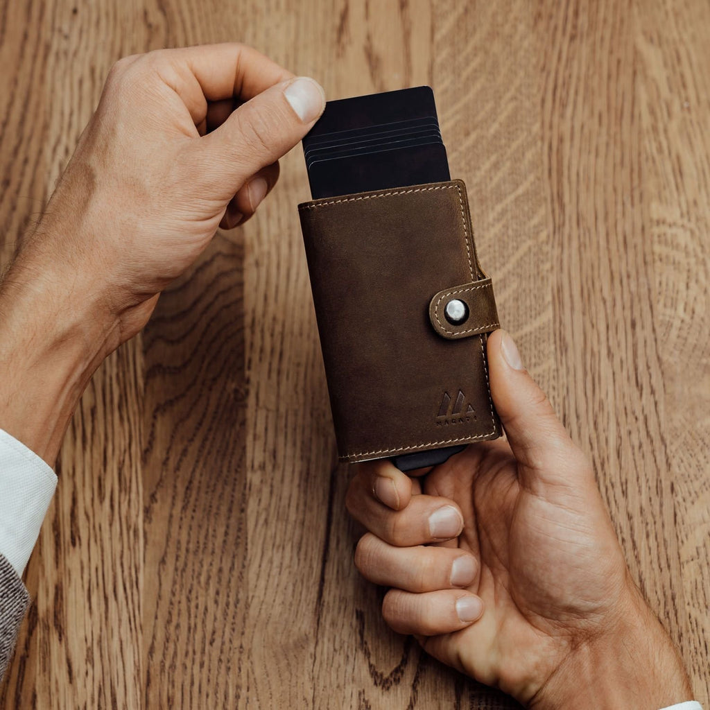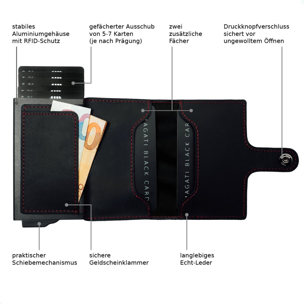 - EINFACHE HANDHABUNG - der Schiebemechanismus unserer Mini-Geldbörse garantiert einen simplen Ausschub der Kreditkarten - zudem gewährleistet der Druckknopfverschluss ein praktisches Öffnen und Schließen der Lederklappe