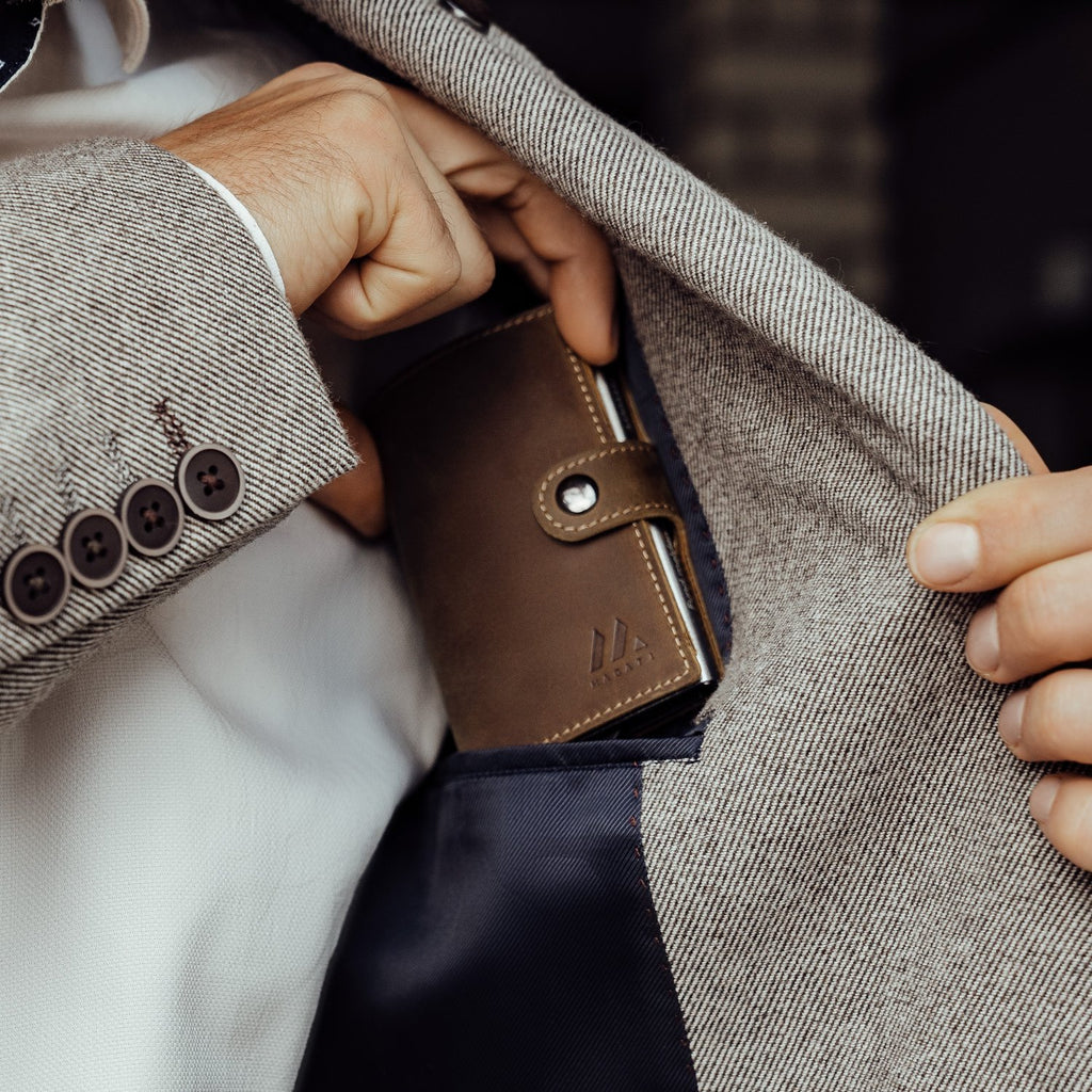 - IDEALE AUFTEILUNG - das Kartengehäuse aus Aluminium bietet Platz für 5-7 Karten (je nach Prägung), die Geldklammer hält Geldscheine und zwei zusätzliche Kartenfächer im Leder bieten außerdem Platz für Kassen-/Notizzettel